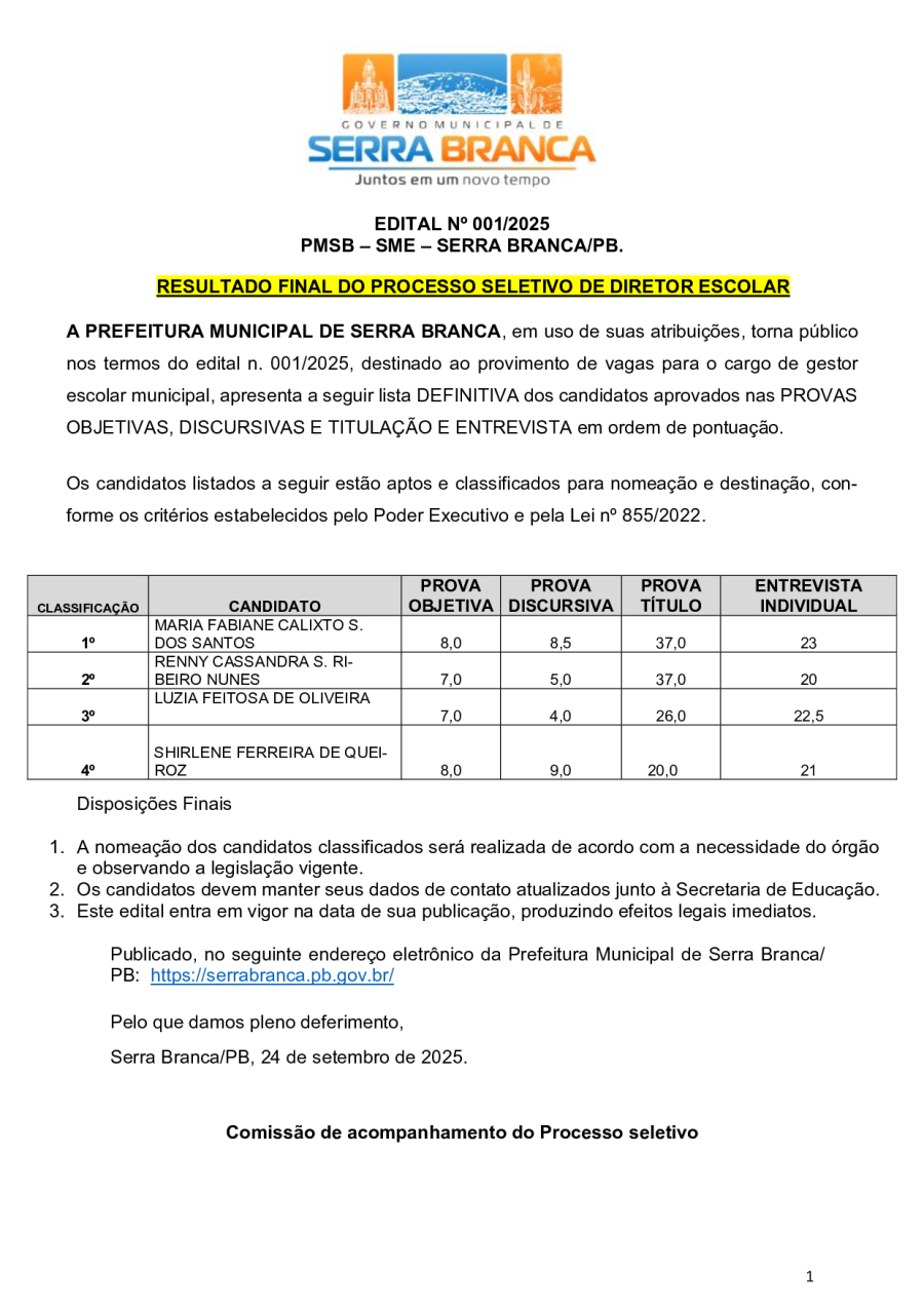 RESULTADO FINAL DO PROCESSO SELETIVO DE DIRETOR ESCOLAR – EDITAL N° 0001/2025