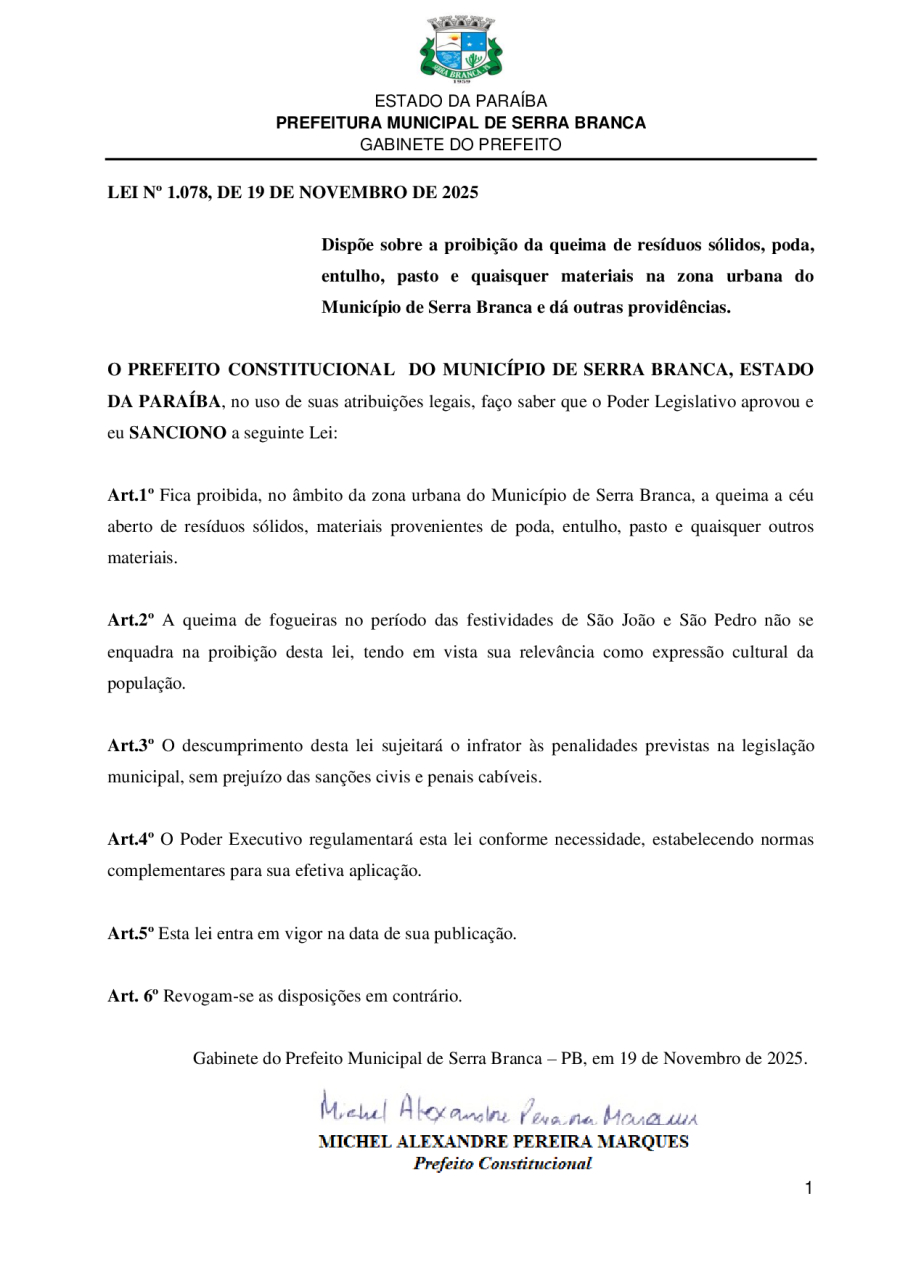 • LEI N° 1078/2025 – DISPÕE SOBRE A PROIBIÇÃO DA QUEIMA DE RESÍDUOS SÓLIDOS, PODA, ENTULHO, PASTO E QUAISQUER MATERIAIS NA ZONA URBANA DO MUNICÍPIO