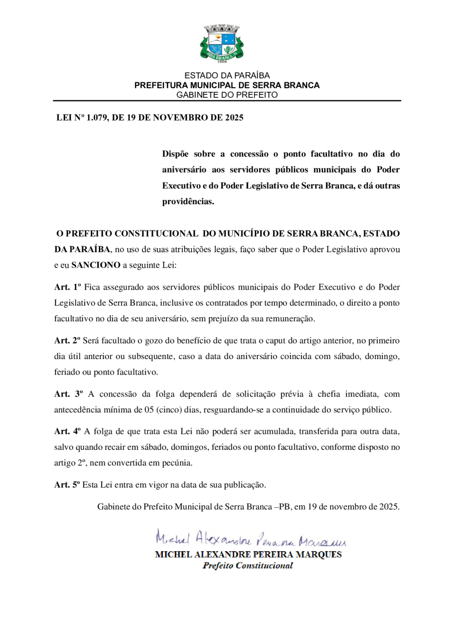 LEI N° 1079/2025 – DISPÕE SOBRE A CONCESSÃO O PONTO FACULTATIVO NO DIA DO ANIVERSÁRIO AOS SERVIDORES PÚBLICOS MUNICIPAIS DO PODER EXECUTIVO E DO PODER LEGISLATIVO DE SERRA BRANCA