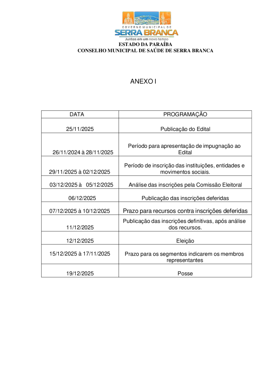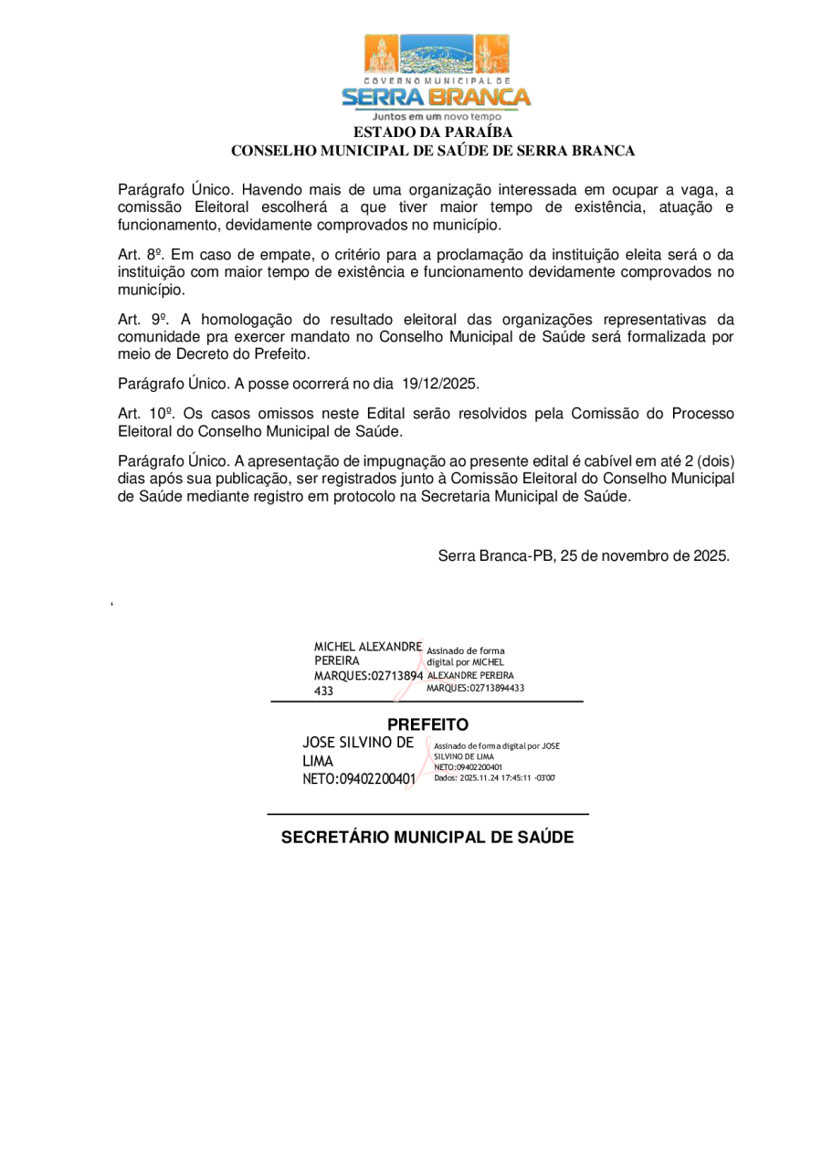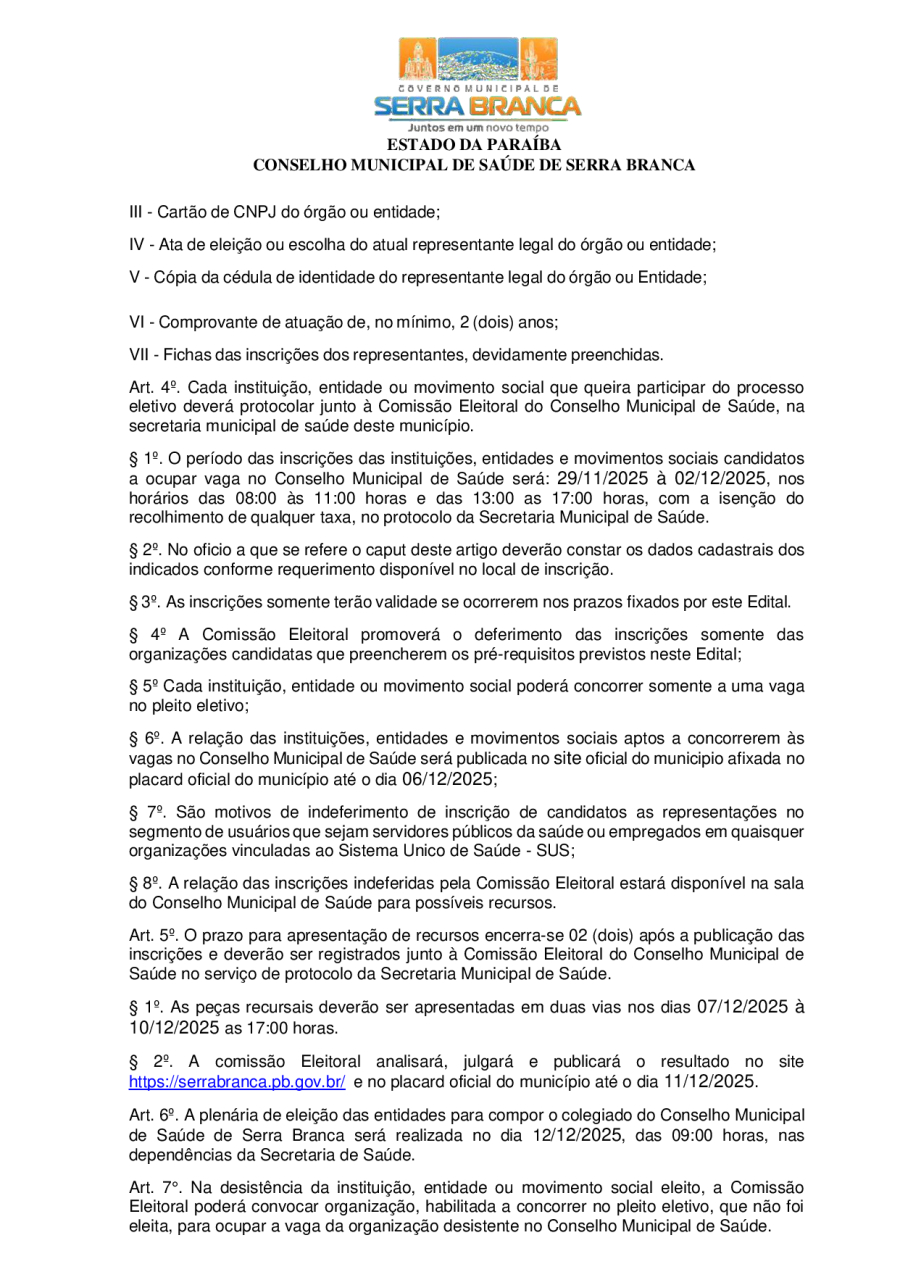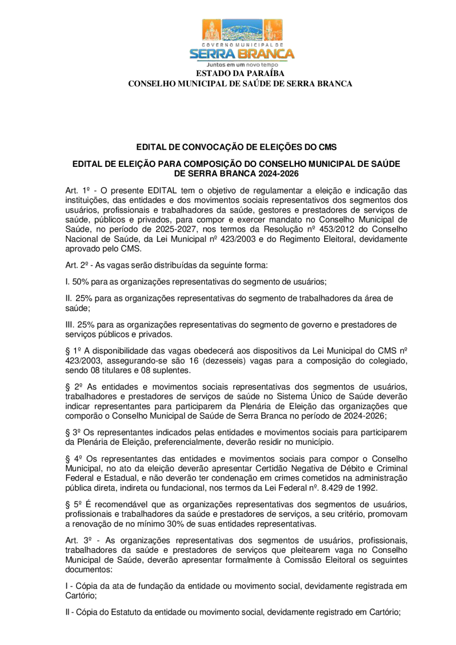 EDITAL DE ELEIÇÃO PARA COMPOSIÇÃO DO CONSELHO MUNICIPAL DE SAÚDE DE SERRA BRANCA 2024-2026