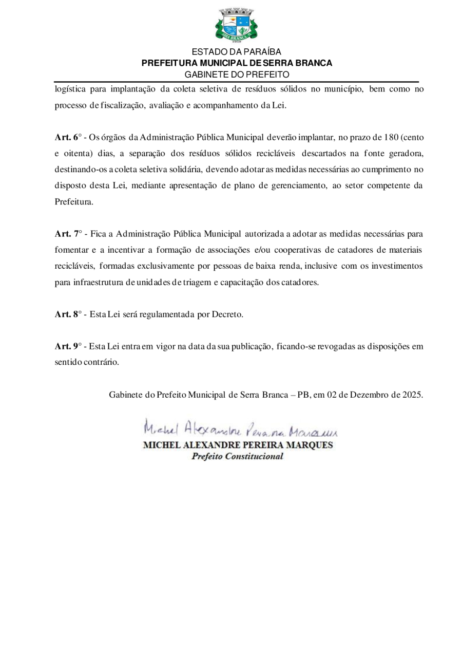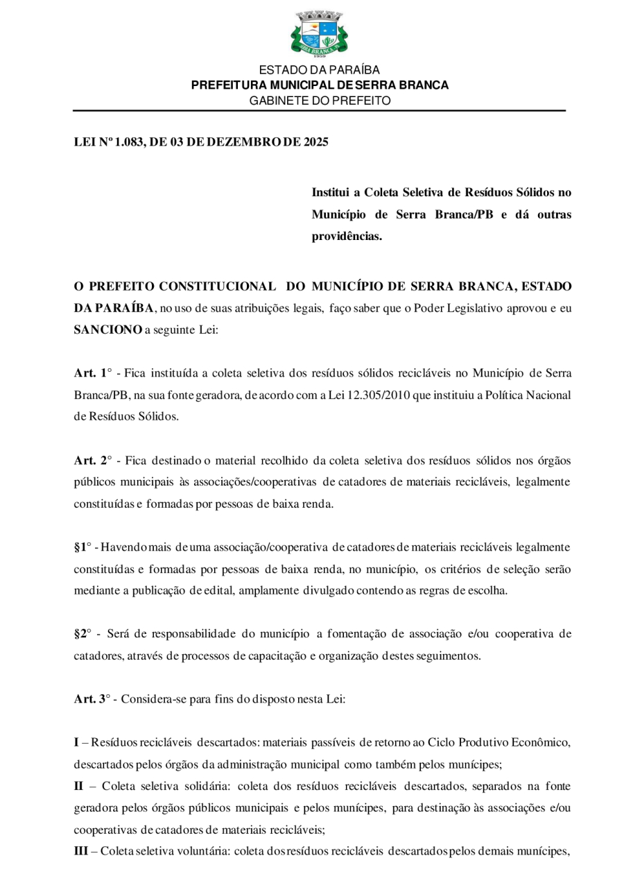LEI N° 1083/2025 – INSTITUI A COLETA SELETIVA DE RESÍDUOS SÓLIDOS NO MUNICÍPIO