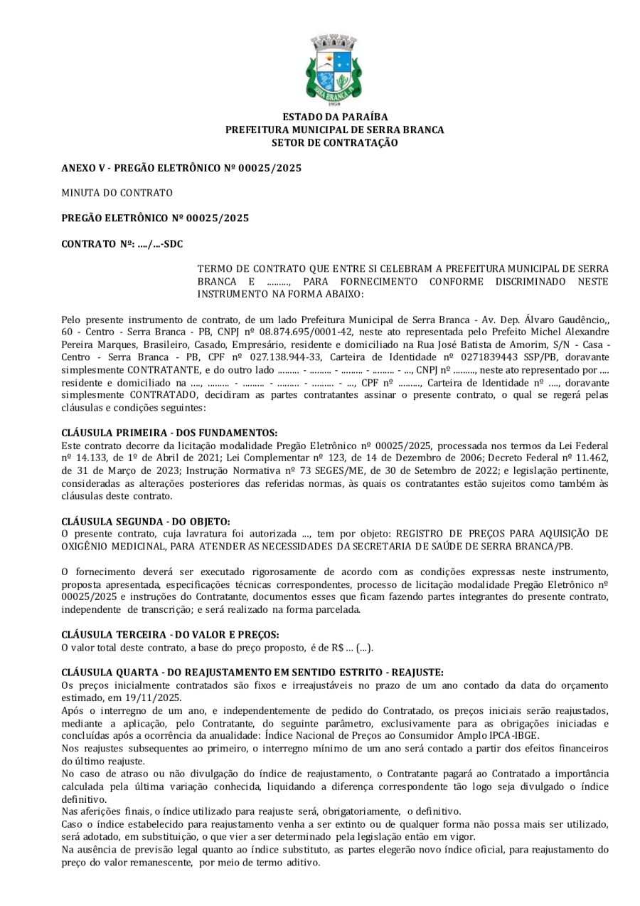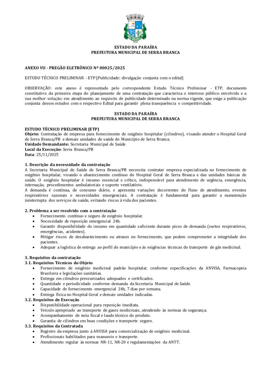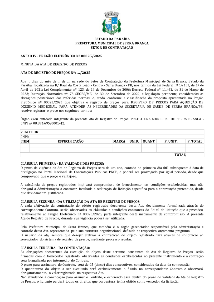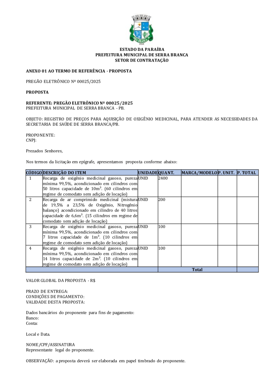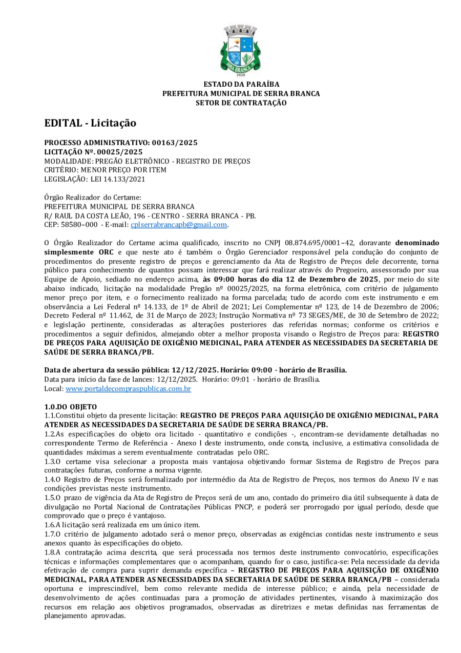 EDITAL PREGÃO ELETRÔNICO 00025/2025 – REGISTRO DE PREÇOS PARA AQUISIÇÃO DE OXIGÊNIO MEDICINAL, PARA ATENDER AS NECESSIDADES DA SECRETARIA DE SAÚDE DE SERRA BRANCA/PB.